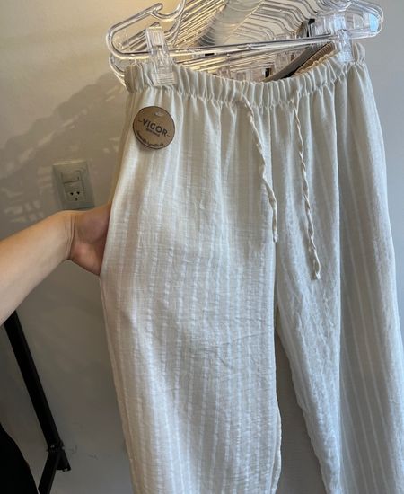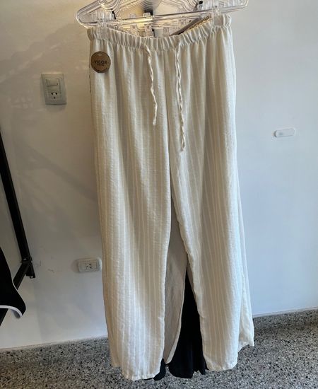 Pantalon largo de lino con rayas y cordon de la misma tela en la cintura. Muy buena calidad, no se transparenta.