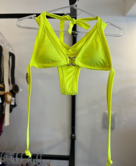 Bikini con dije en el corpiño, bombacha tiro a la cadera.