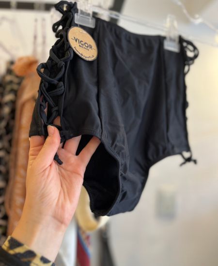 Bombacha vedetina tiro alto se regula con cordon al costado. Abarca 2 talles.